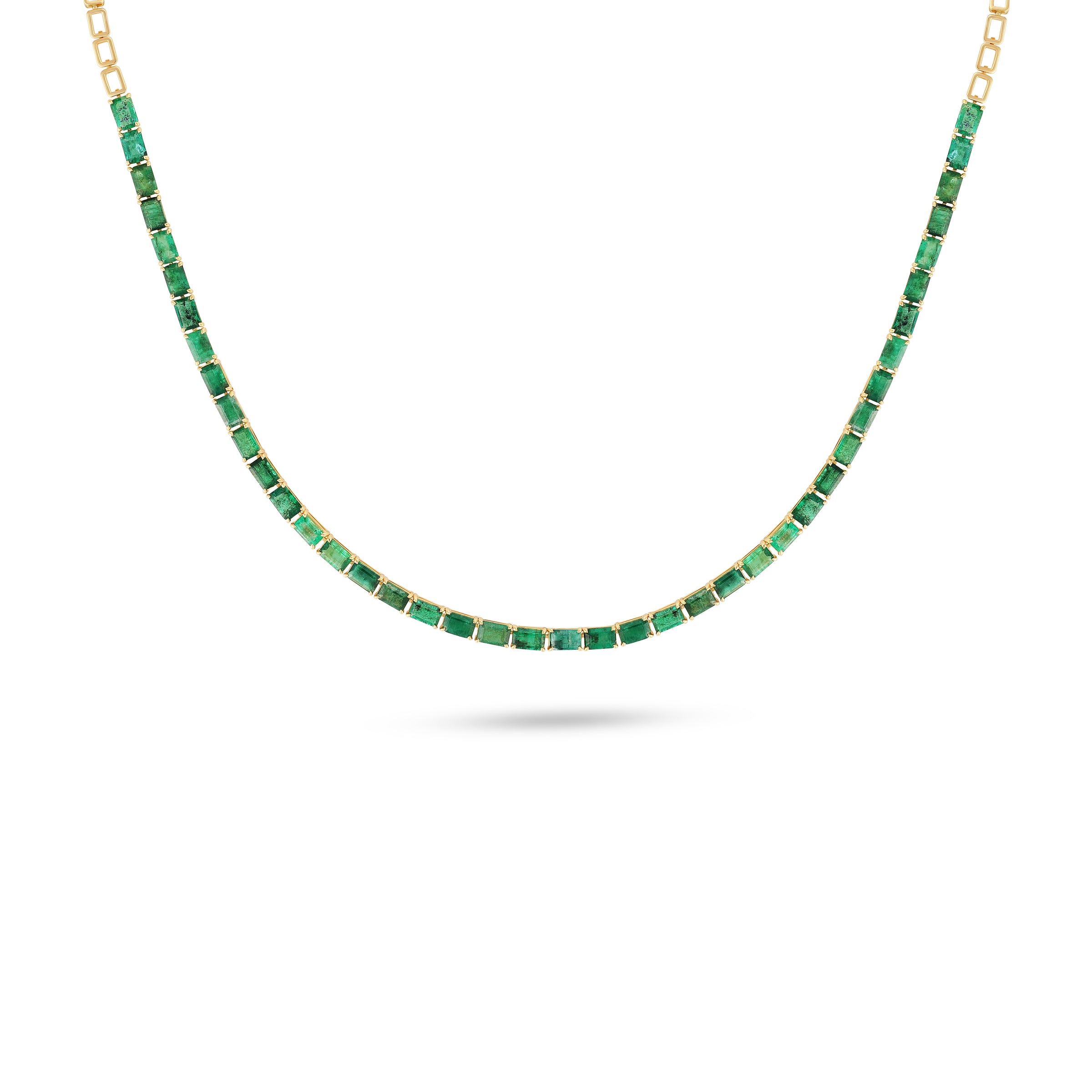 This sideways-set emerald necklace, featuring perfectly calibrated emeralds in a classic prong setting, is effortlessly elegant yet easy to wear. Ideal for a night out, it’s just as striking worn on its own with a plain T-shirt and jeans, or layered and stacked to add depth and sophistication to your everyday look. A timeless piece with a fresh, modern edge.