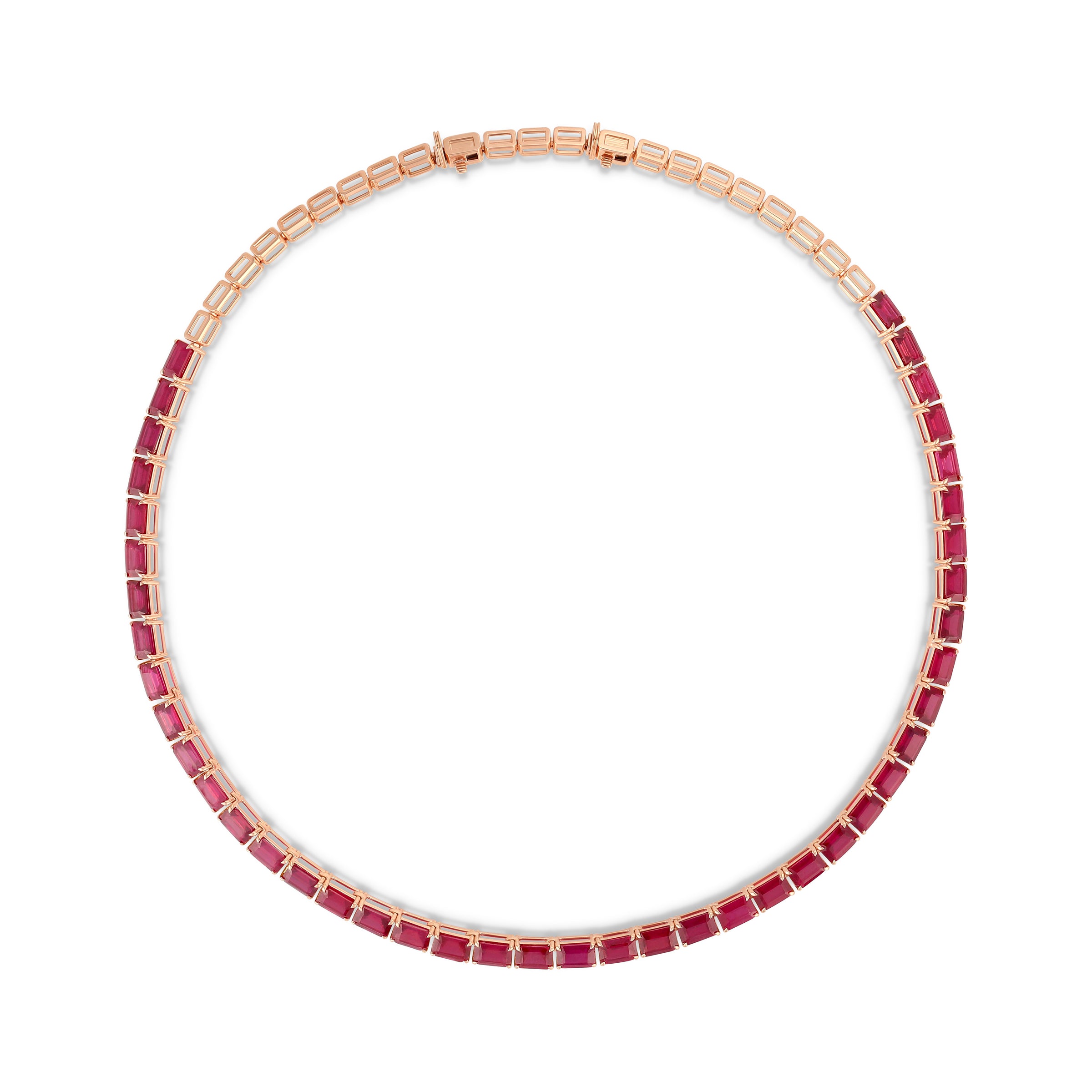 A modern classic with a rich color. This sideways-set ruby necklace, featuring perfectly calibrated rubies in a classic prong setting, is effortlessly striking yet easy to wear. Ideal for a night out, it’s just as beautiful worn on its own with a plain T-shirt and jeans, or layered and stacked to elevate your everyday look. A timeless piece with a refined, modern edge.